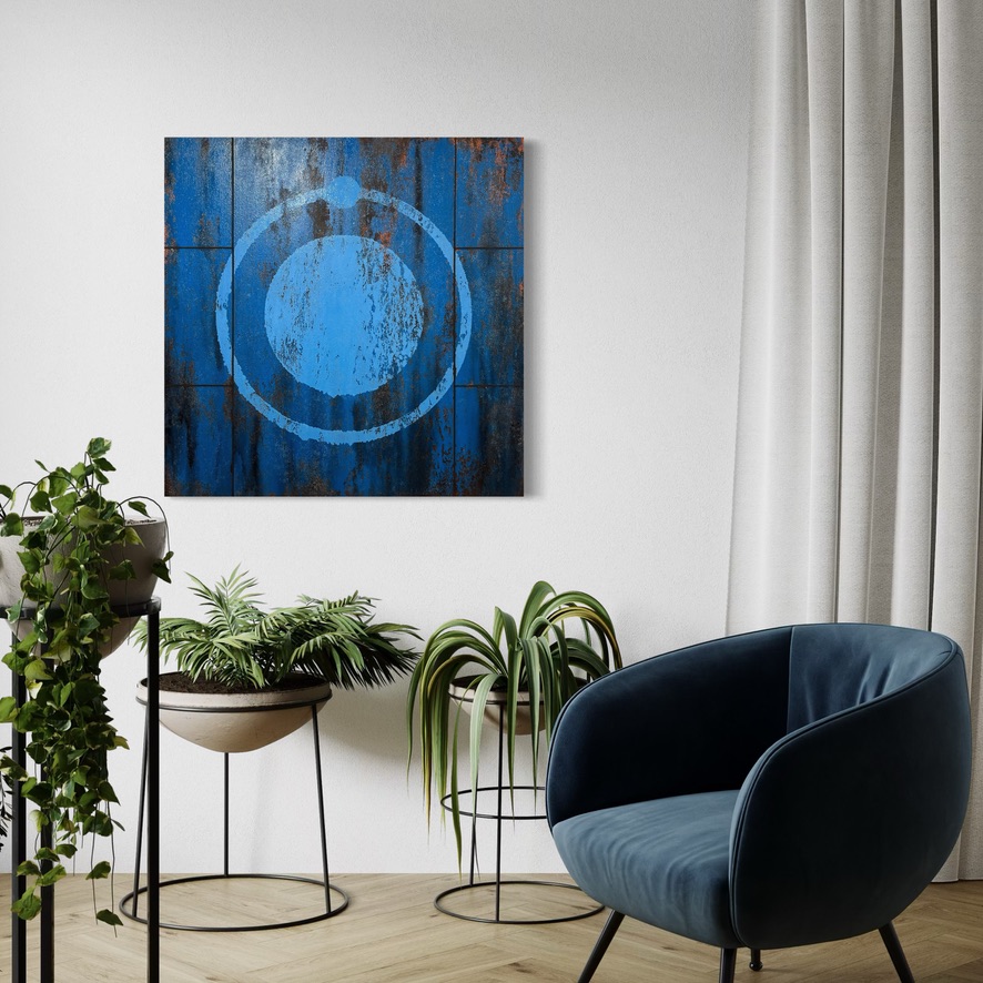 | Media | Salvaged gloss paints on canvas covered FSC certified pannel. |