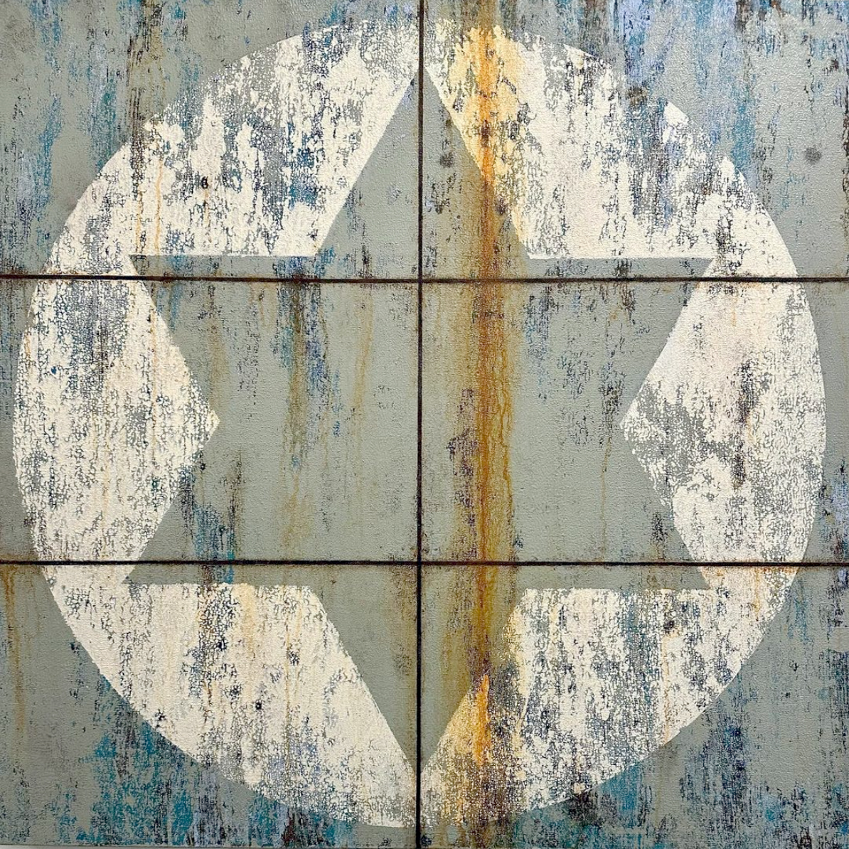 In an effort to minimise the negative environmental impact of art production, this piece is almost composed almost entirely of paint that has been salvaged from post-consumer sources, predominantly municipal waste disposal facilities. In other words, it is made from paint that has been thrown away. By diverting these perfectly viable paints from landfill, their future is transformed from harmful to harmonious, and reduces production and consumption of virgin materials.