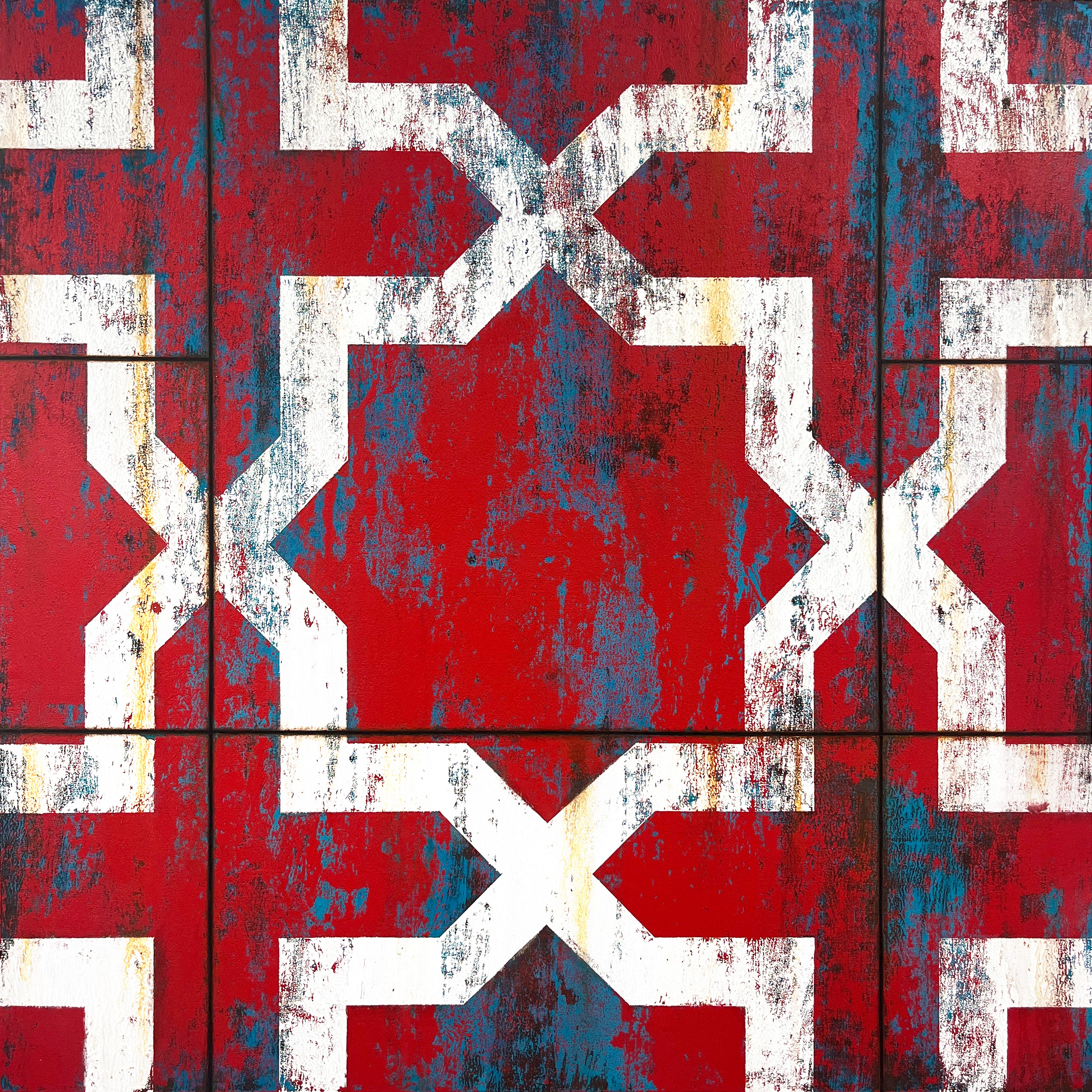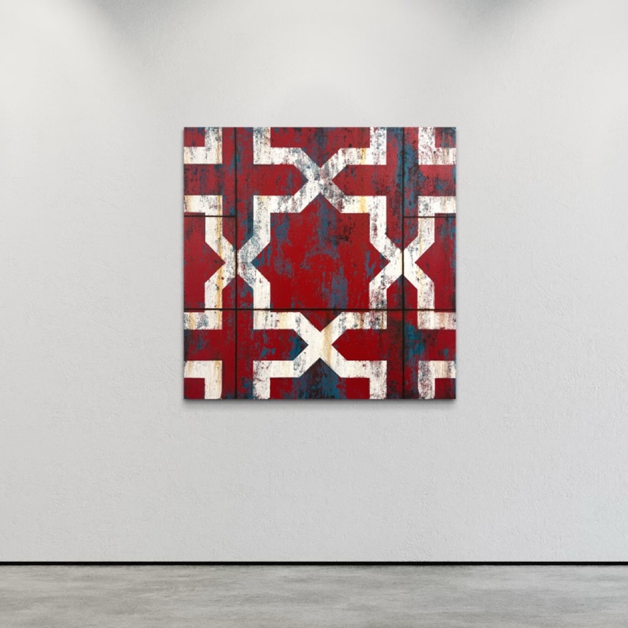 Painted entirely using emulsion paints salvaged from post consumer sources, and drawing upon compositional elements including Western and Eastern sacred geometry, this piece is intended to remind us of the cosmological principles that unite us with the universe. What we interpret as rust and decay is simply the impact of time and energy reconfiguring the combinations of atoms that constitute what our senses perceive as physical reality. The repurposed paints used to make this piece references that all matter, including the atoms that make up our own bodies, is eternally recycled into new formats.